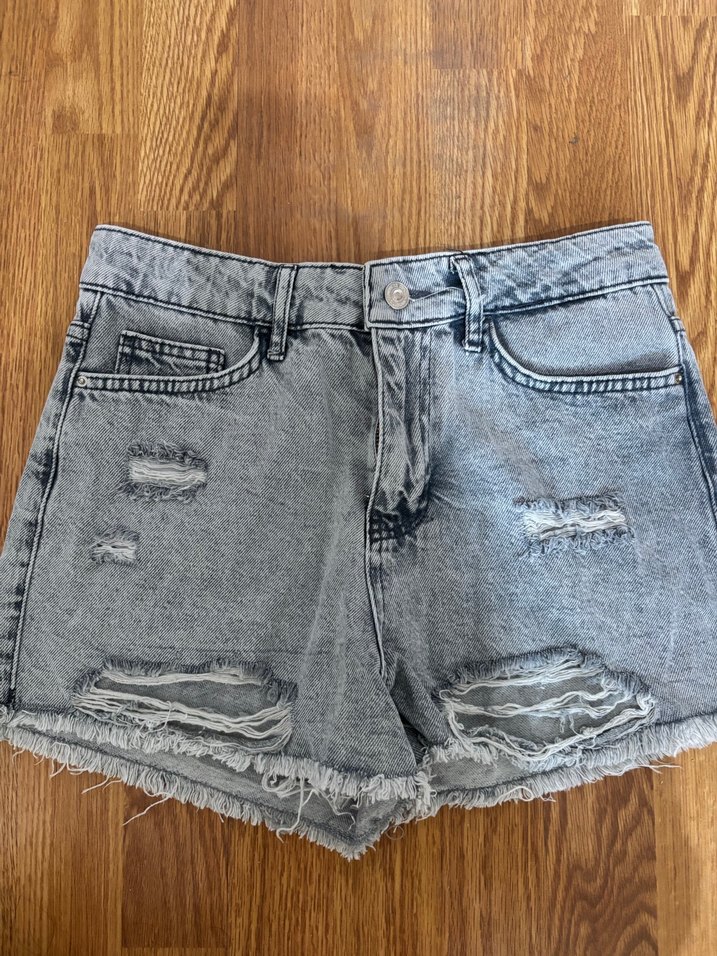 Gri renkli,yırtık detaylı, bol kesim denim mini şort, günlük rahat sokak stili için uygundur.