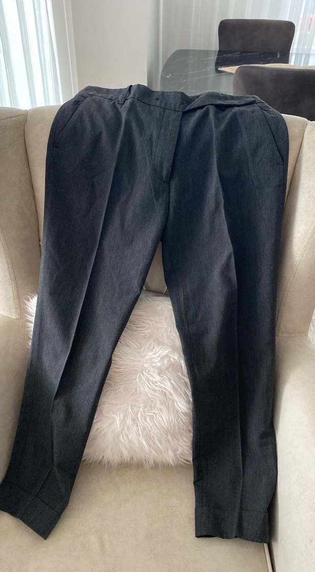 Gri renkli, regular fit ve pileli tasarıma sahip denim pantolon. Ofis kullanımı için uygun, midi boyda ve normcore tarzında şık bir parça.