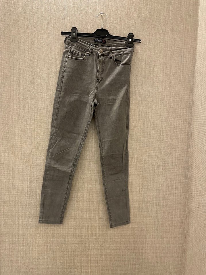 Gri renkte ve normal boyda, dar kesim kadın denim pantolon. Normcore tarzıyla günlük kullanıma uygun, desensiz ve rahat bir model.