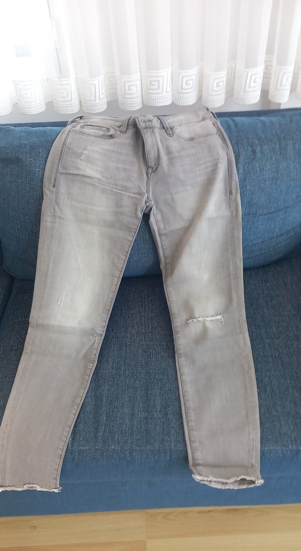 Gri renkli, ince kesim, normal boy kadın denim pantolon. Günlük rahat kullanım için tokalı detay içerir.