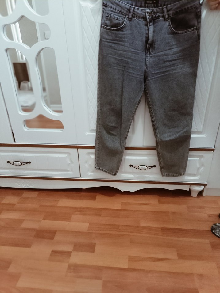 Gri renkli kadın denim pantolon, normal boyda ve kemerli. Rahat kesimiyle günlük sokak tarzına uygun, desensiz ve şık görünümlü.