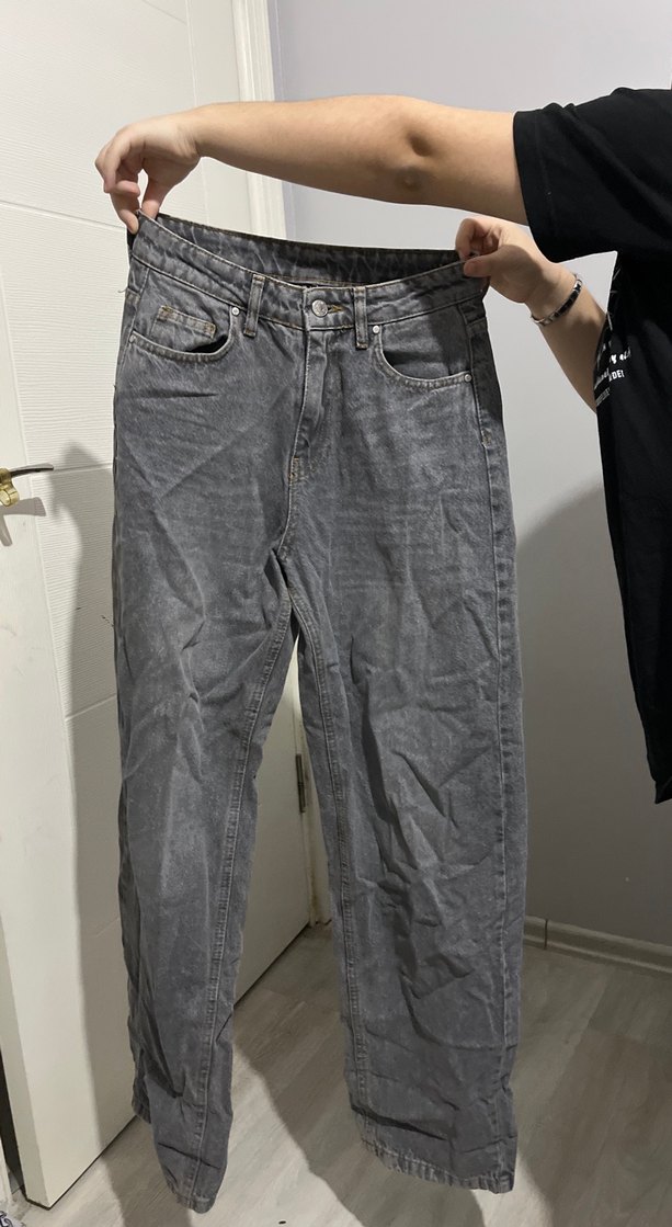 Gri renkli, salaş kesim ve normal boyda denim pantolon, günlük rahat ve şık bir tarz sunar. Trendy sokak stili için uygun.