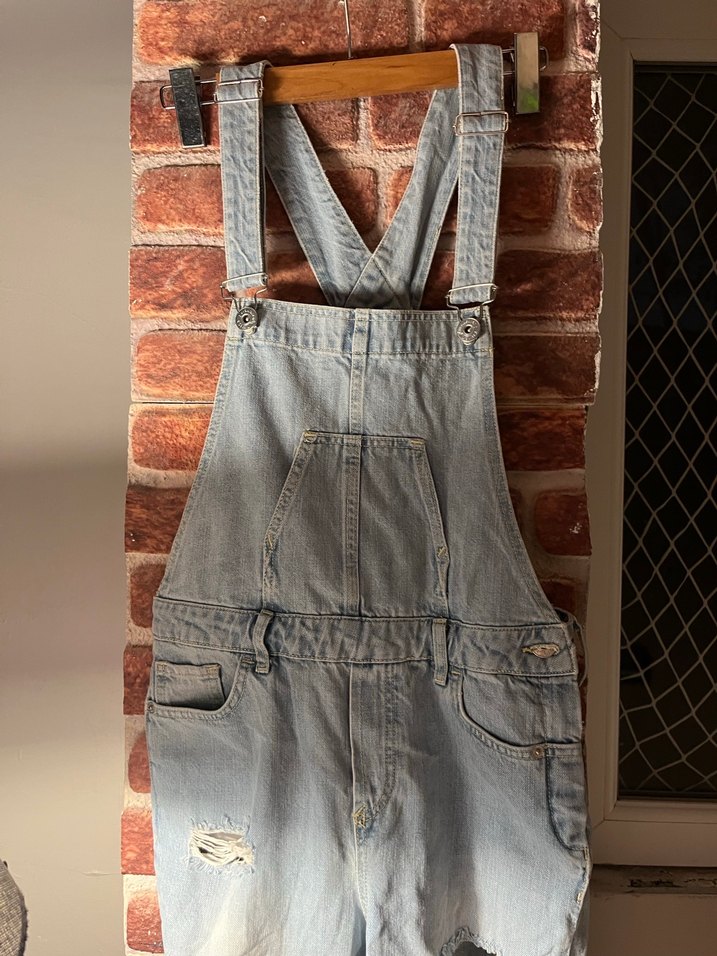 Gri renkli, bol kesim denim tulum, tokalı askılar ve yüksek yakalı tasarıma sahip, günlük rahat stil için uygun.