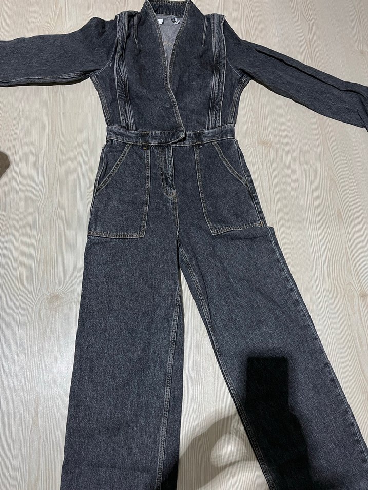 Gri Kadın Denim Tulum, Uzun Kollu, Kemerli