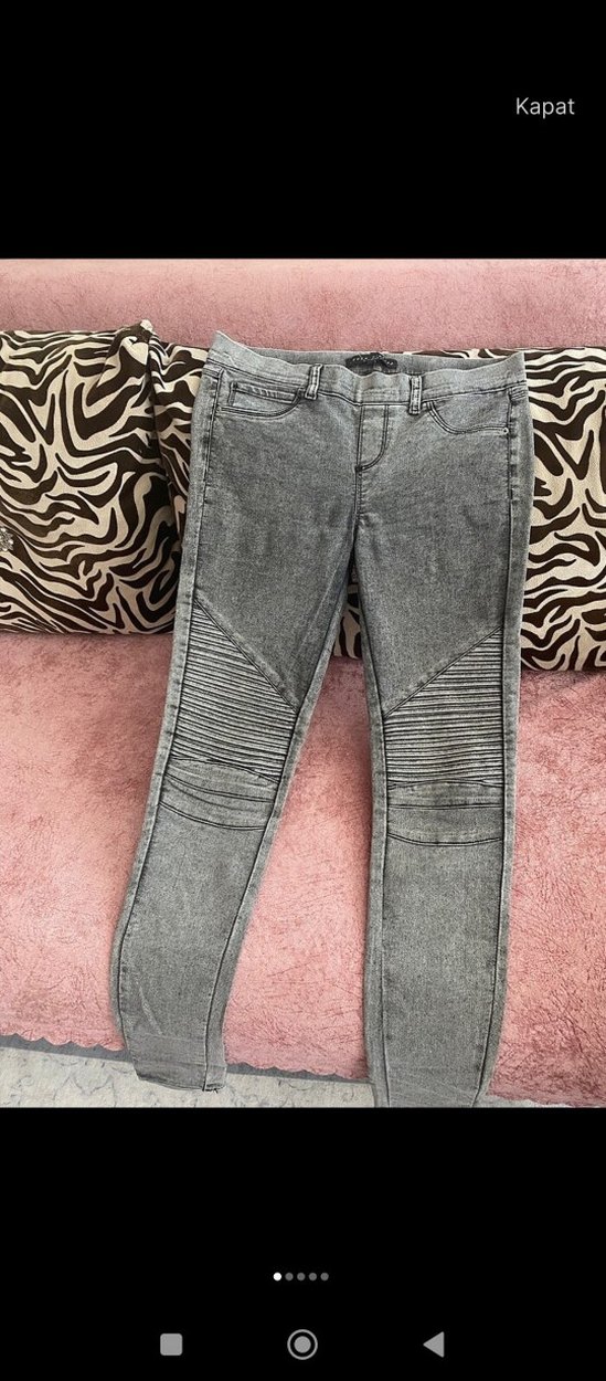 Gri denimden yapılmış, diz kısmında pile detaylı ve zebra desenli, sokak modasına uygun fitted kadın pantolon.