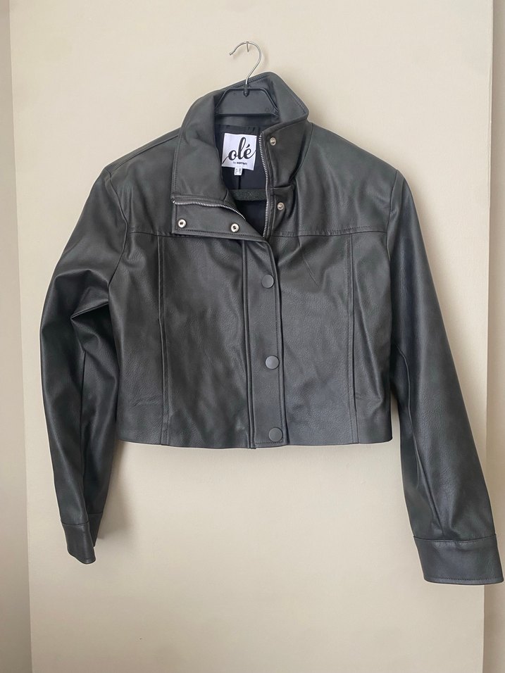 Gri deri biker ceketin yakası kırmalı, düğmeli önü ve uzun kolları vardır. Normal kesim ve kısa boydadır, sokak tarzı için uygundur.