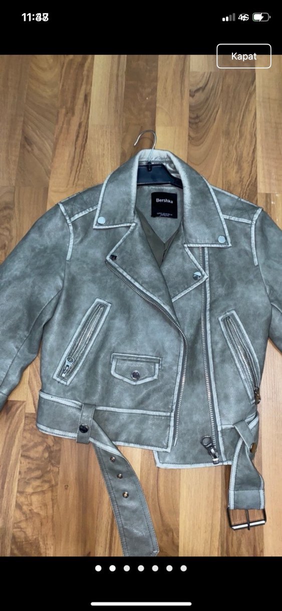 deri malzemeden üretilmiş, kemerli ve çıtçıt detaylı kısa kesim kadın ceketi.