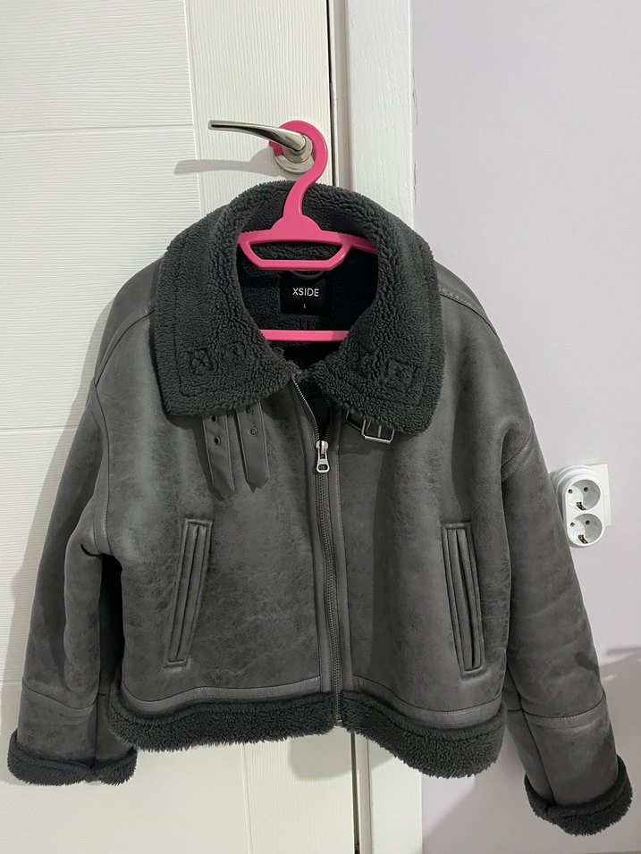 Gri deri ceket, bol kesim, kürk detaylı yakası ve manşetleri ile rahat bir sokak stili sunar. Uzun kollu, normal midi boyda, fermuarlı ve gündelik kullanıma uygun.