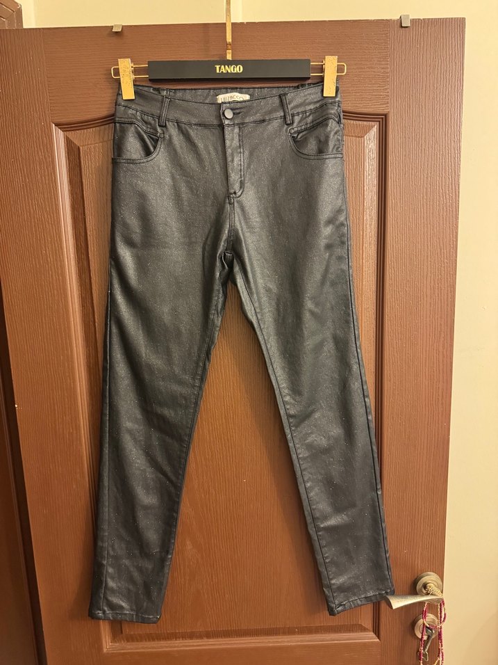 Gri renkli, deri kumaştan, regular fit kesimli, tokalı kadın skinny pantolon. Günlük rahat sokak stili için uygundur. ✨