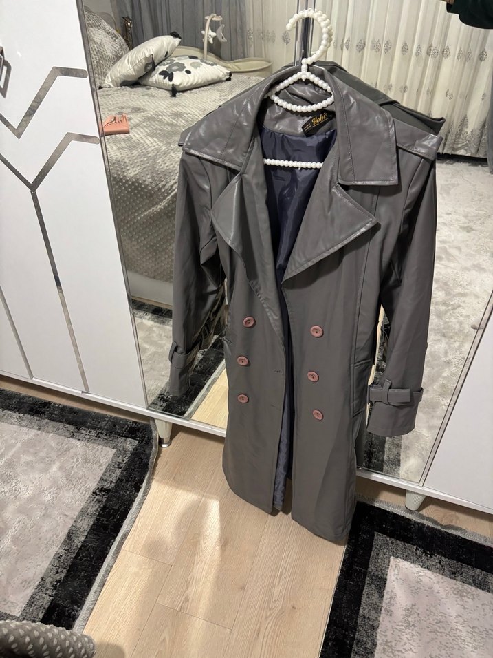 Gri deri uzun trençkot, düğmeli detaylar ve kesik yaka ile şık bir görünüm sunar. Rahat kesimi günlük sokak stili için uygundur.