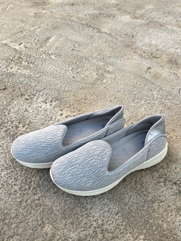 Gri kadın spor ayakkabılar dolgu topuk ve kauçuk tabanlıdır, dış mekan için çağdaş ve zahmetsiz şıklık sunar. Desensiz, trend rahat stil için uygundur.
