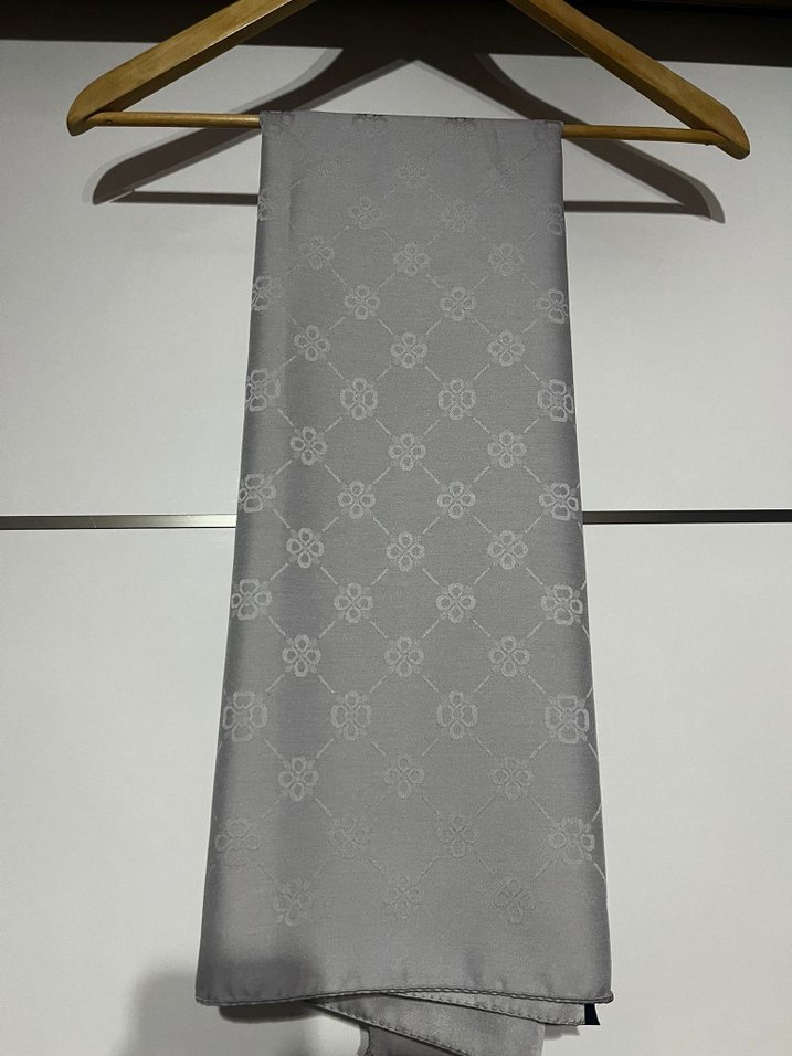 Gri renkte kadın saten şal, hafif çiçek desenli ve drapeli yapısıyla klasik ve minimalist bir tarz sunar. Zarif dokunuşlar için uygundur.
