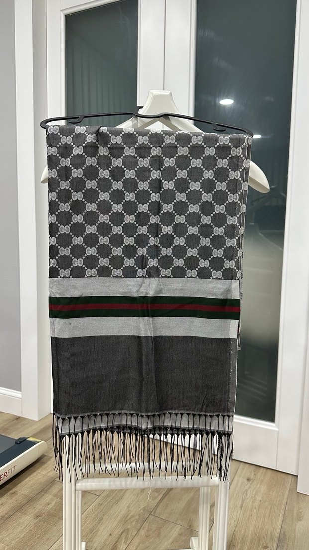 Gri renkte, drapeli tasarıma ve püskül detaylara sahip kadın şalı. Yumuşak sentetik kumaştan üretilmiş, trend sokak stili için ideal.