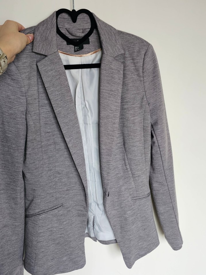 Gri renk, düğmeli, notched yaka detaylı, uzun kollu, midi boy regular fit kadın blazer. Ofis için uygun, sentetik kumaştan üretilmiştir.