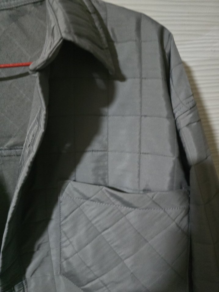 Gri renkte, düğmeli, yakalı ve sentetik kumaştan yapılmış kadın ceketi. Normal uzunlukta, uzun kollu ve sokak stiline uygun sade tasarıma sahip.