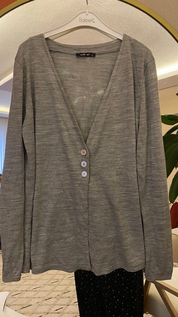 Gri renkte, düğmeli, notlu yaka ve uzun kollu kadın hırka. Rahat kesimi ve yumuşak kumaşıyla günlük kullanıma uygundur.