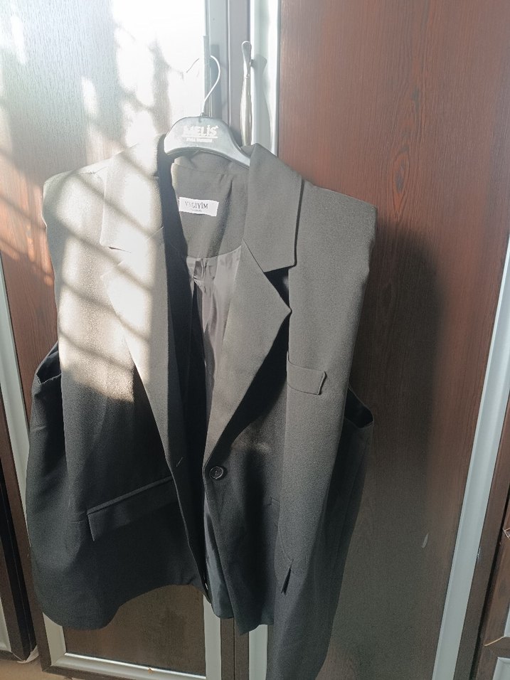 Düğmeli, kolsuz gri blazer ceket, notched yaka ve normal kesim. Ofis için uygun midi boyda, sentetik kumaştan yapılmıştır.