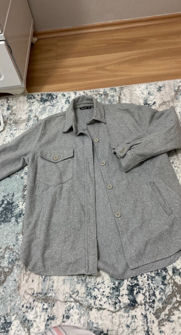 Gri renkte, uzun kollu, düğmeli ve cepli kadın midi ceketi. Rahat kesimli, yumuşak ve sıcak kumaştan, günlük kullanıma uygun.