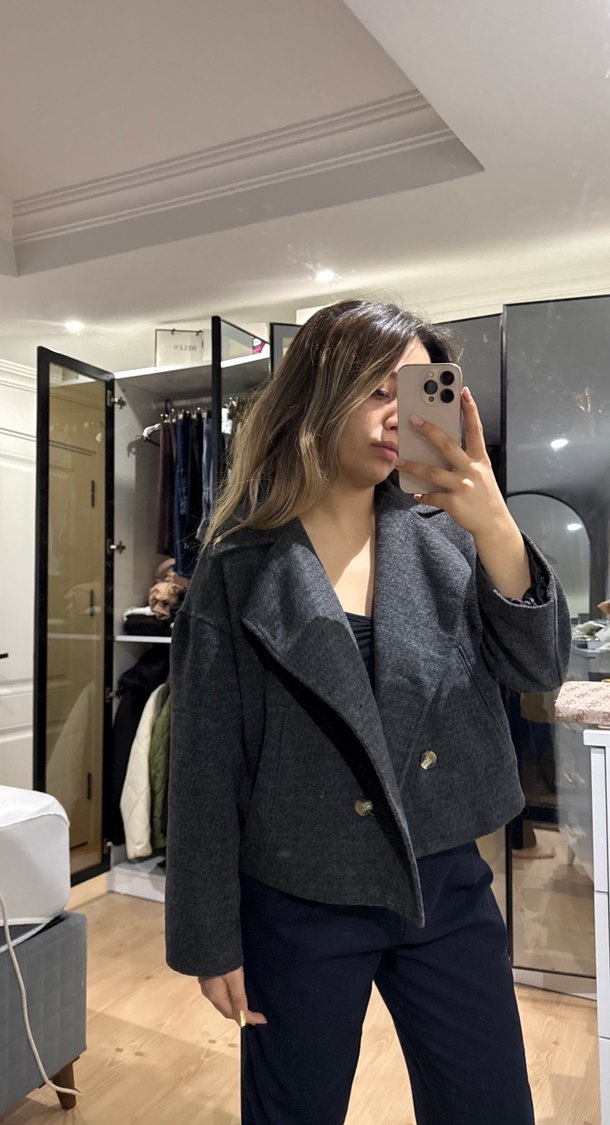 Gri Kadın Düğmeli Midi Ceket