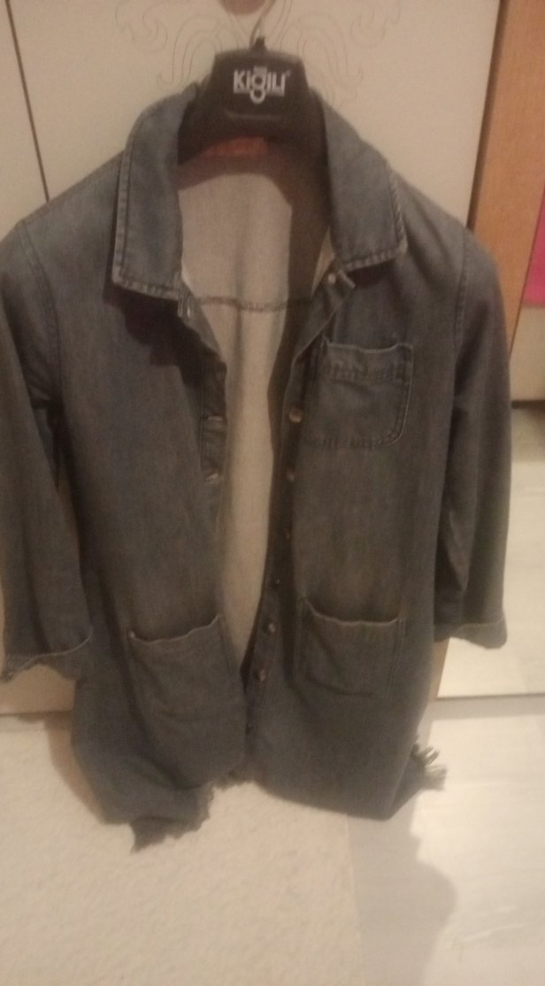 Gri renkte, düğmeli, uzun kollu ve paça yakalı, rahat kesim midi uzunlukta kadın denim ceketi. Günlük kullanıma uygun sokak stili.