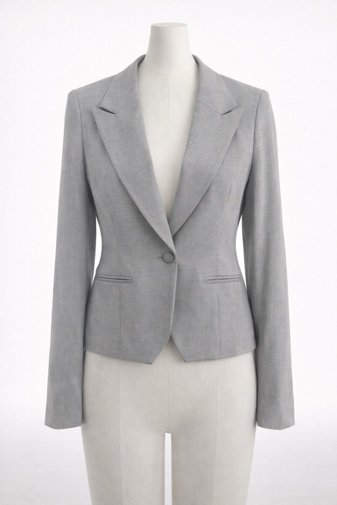 Gri renkte, düğmeli ve kesimli yaka detaylı kadın blazeri, uzun kollu ve ipeksi dokusu ile klasik ve şık bir ofis görünümü sunar. Tekstil ürünüdür
