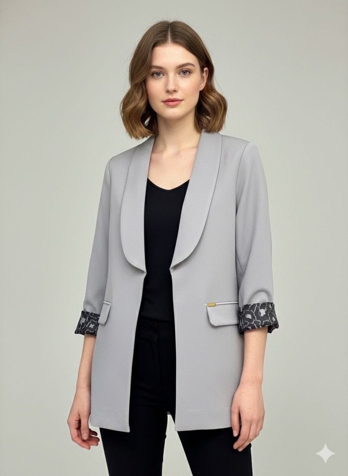 Gri renkli, uzun kollu ve düğmeli kadın blazer. Normal kesim ve midi boyda, ofis için uygun, modern ve desensiz tasarım.