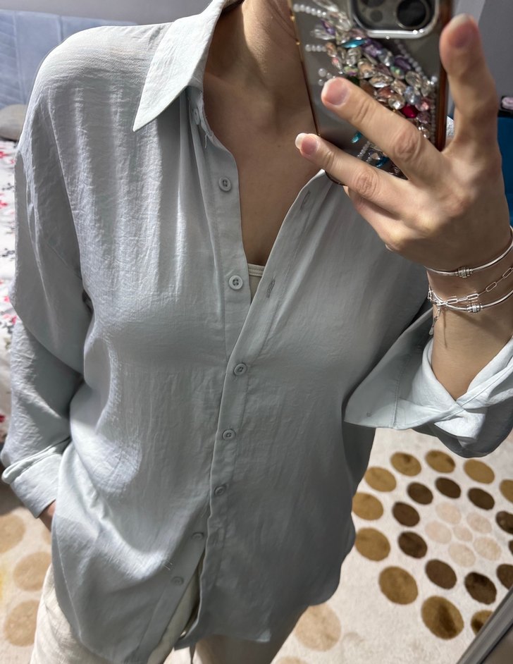 Gri renkli, düğmeli, yakalı ve uzun kollu, bol kesim kadın gömleği, ipeksi kumaştan, gündelik şıklık için uygun.