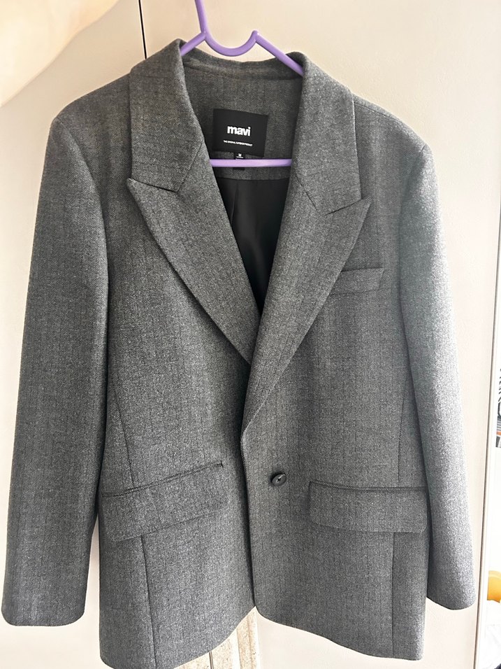 Gri yün kumaştan, notalı yaka ve düğmeli kapamalı, uzun kollu, normal kesim kadın blazer ceket.