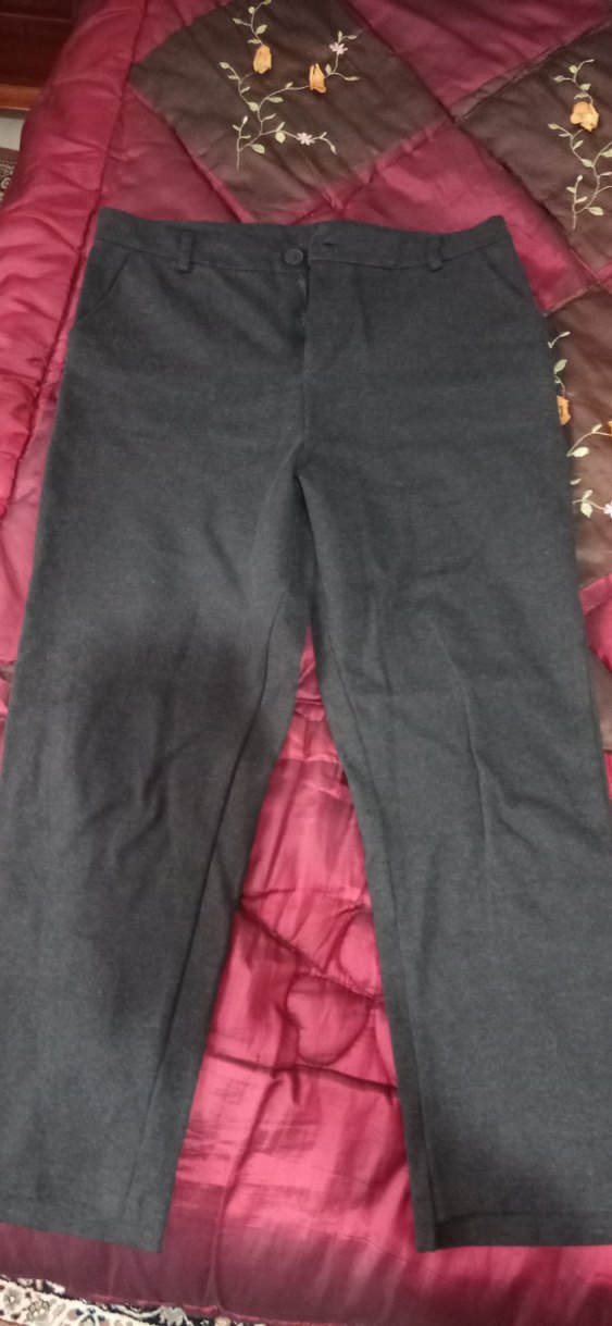 Gri renkte, düğmeli ve düz kesim kadın kumaş pantolon, günlük kullanıma uygun, rahat ve şık bir görünüme sahiptir.