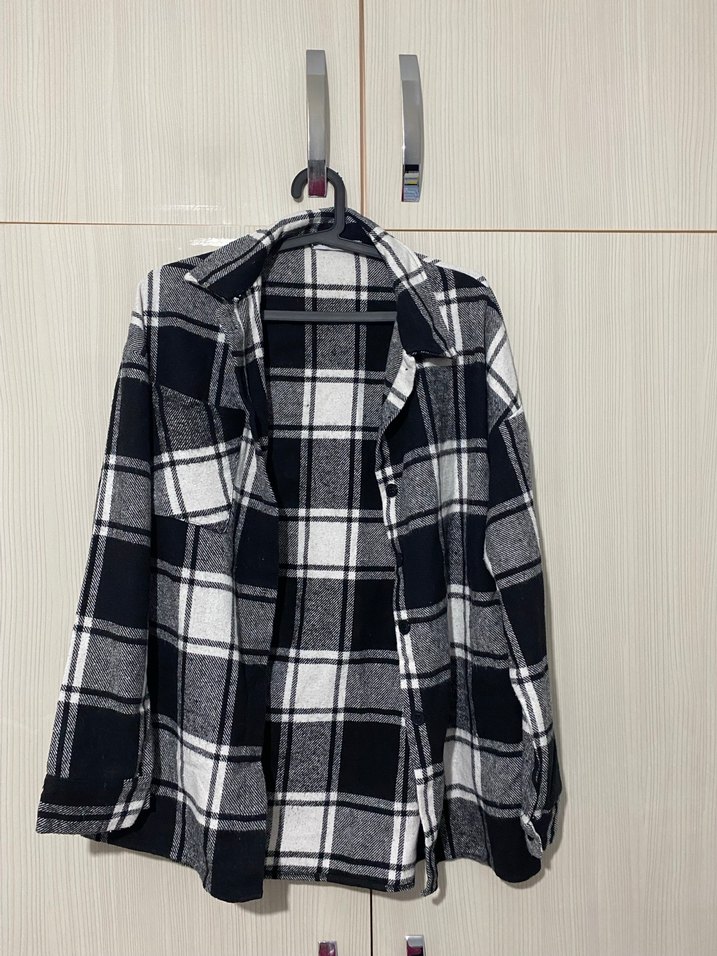 Gri ekose desenli, düğmeli uzun kollu gömlek. Notlu yaka, bol kesim ve midi boy uzunluğu ile yumuşak ve sıcak dokulu kumaştan üretilmiştir.