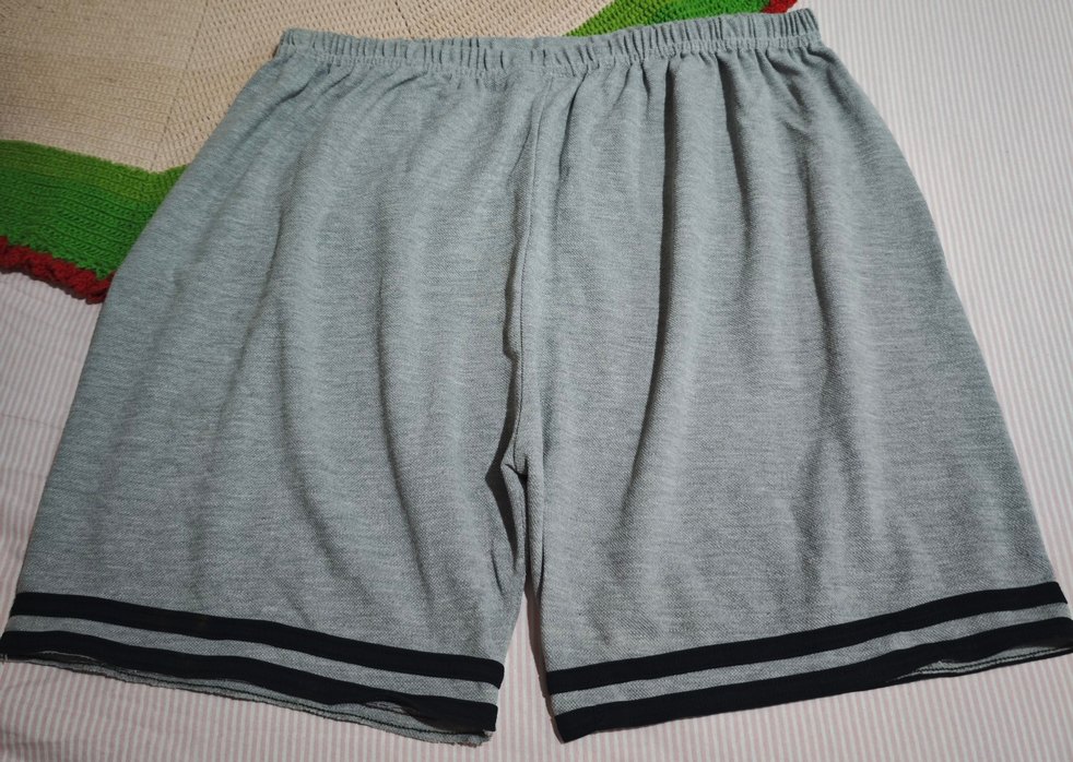 Gri renkte, elastik bel bandına sahip, rahat kesim kadın erkek bermuda şort. Siyah çizgili etek ucu ufak dikiş hatası var spor ve sokak stiline uygun.