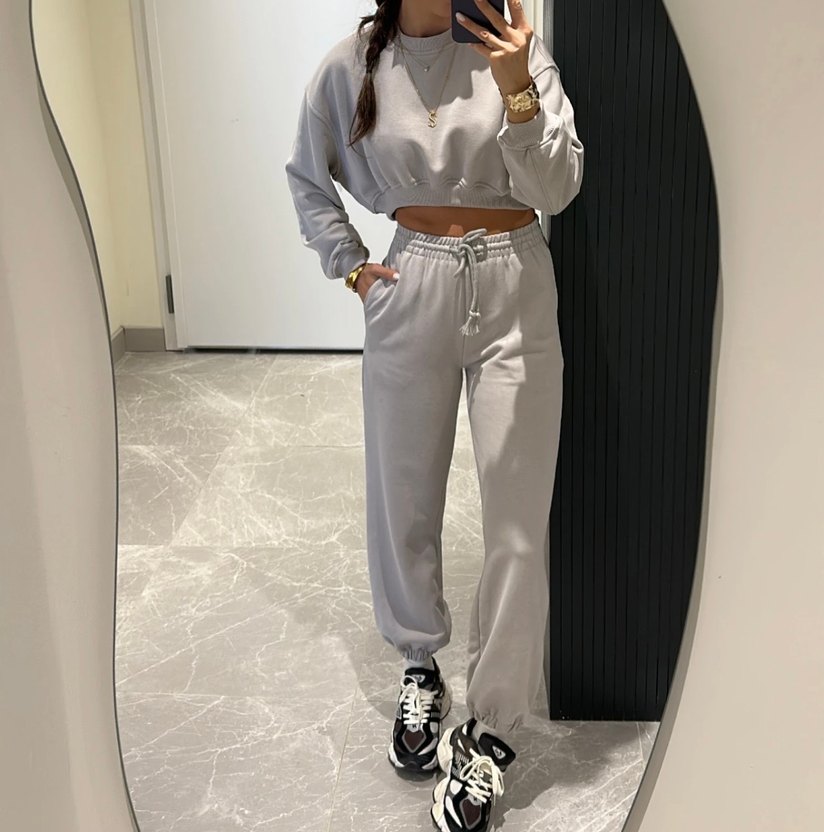 Kadınlar için gri, uzun kollu, bisiklet yaka ve bol kesim eşofman takımı. Yumuşak ve sıcak dokusu günlük rahat şıklık sunar. Üstü crop, altı ayarlanabilir bel detaylıdır.