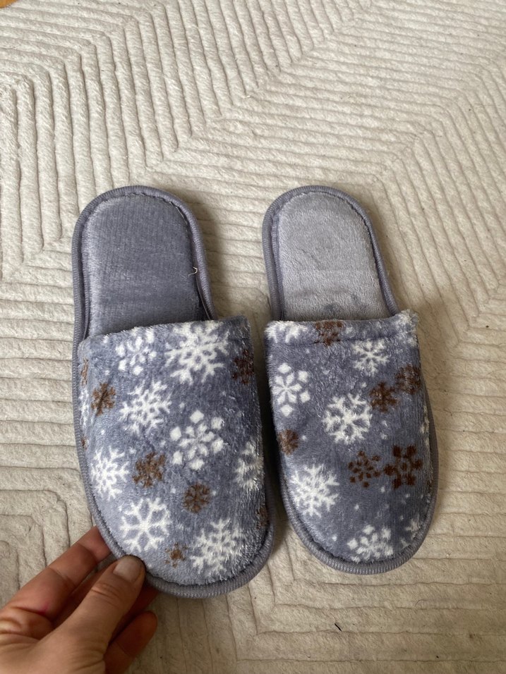 Gri renkli, örgü görünümlü polar üst yüzeye sahip kadın ev terliği. Beyaz ve kahverengi kar tanesi desenleriyle, yumuşak ve rahat. Düz tabanlıdır. ❄️