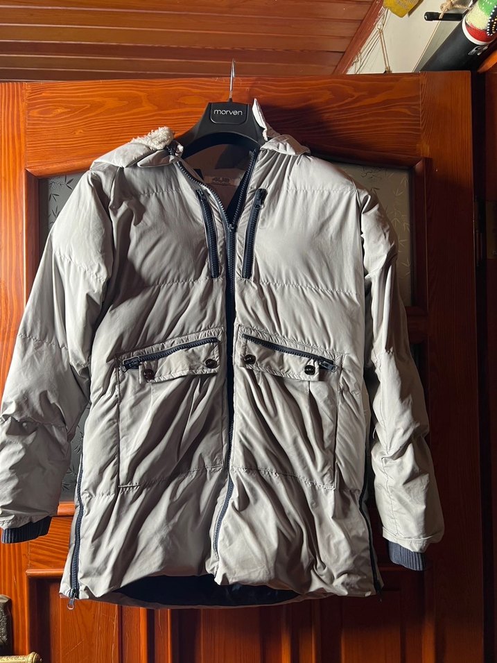Gri renkte, fermuarlı cepleri olan, notched lapel yakalı, sentetik kumaştan yapılmış, uzun kollu ve midi boyda, sokak tarzına uygun dar kesim kadın mont.