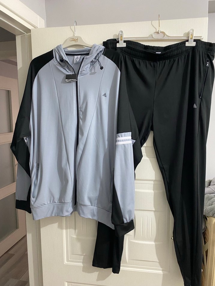 Gri renkte, yüksek yakalı ve uzun kollu, bol kesim kadın spor takımı. Sentetik kumaştan, fermuarlı detaylara sahip, spor için uygun sokak stili büyük beden çok rahat şık hızlı kuruyan kırışmaz diz izi yapmaz yumaş