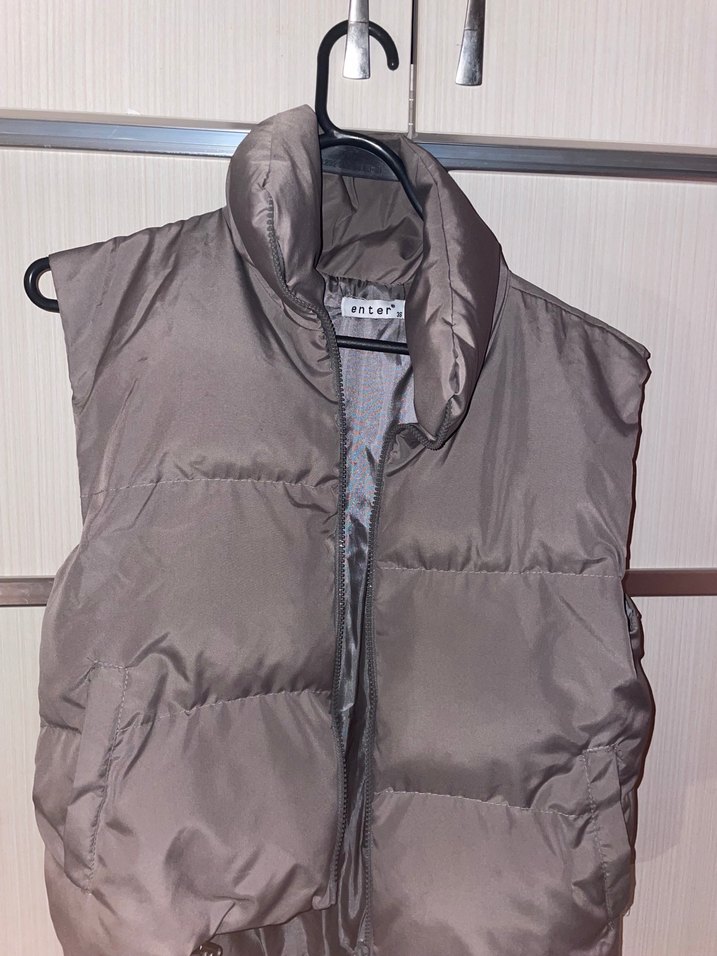 Gri renkte, fermuarlı, yüksek yakalı, kolsuz kadın yeleği. Rahat ve sıcak kumaşla, günlük kullanıma uygun, midi boyda ve sade tasarımlı.