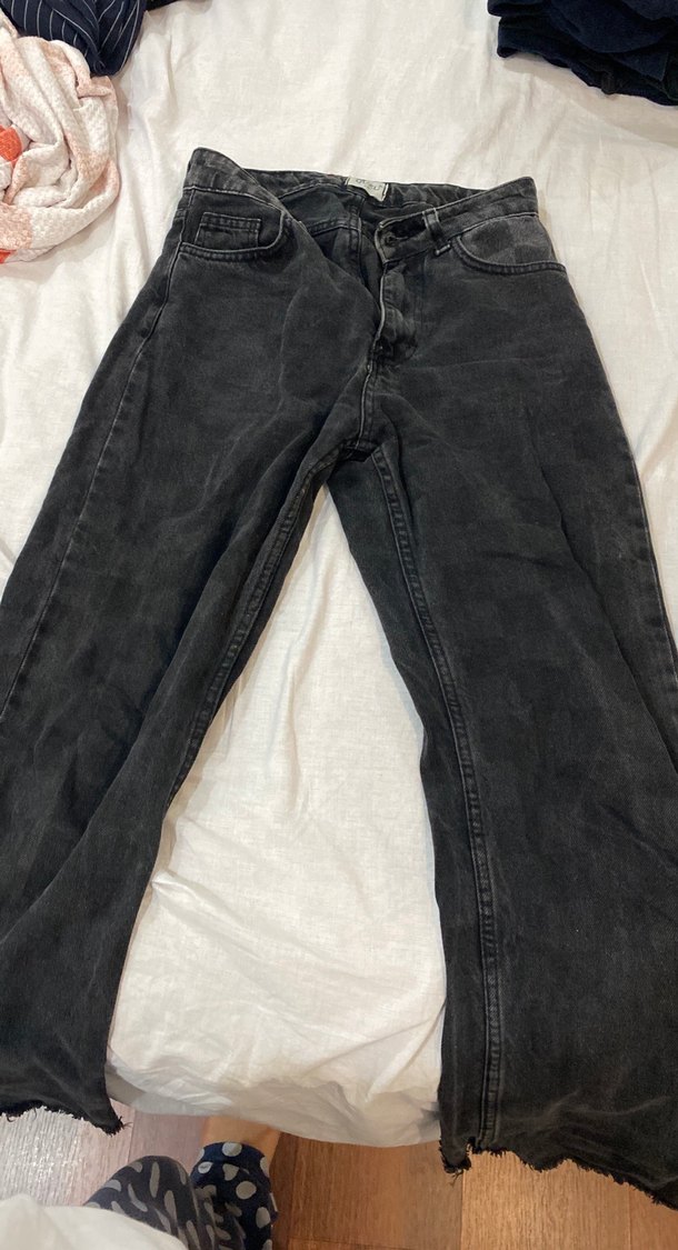 Gri denim kumaştan, geniş kesim ve midi boyda, gündelik kullanıma uygun rahat ve şık kot pantolon.
