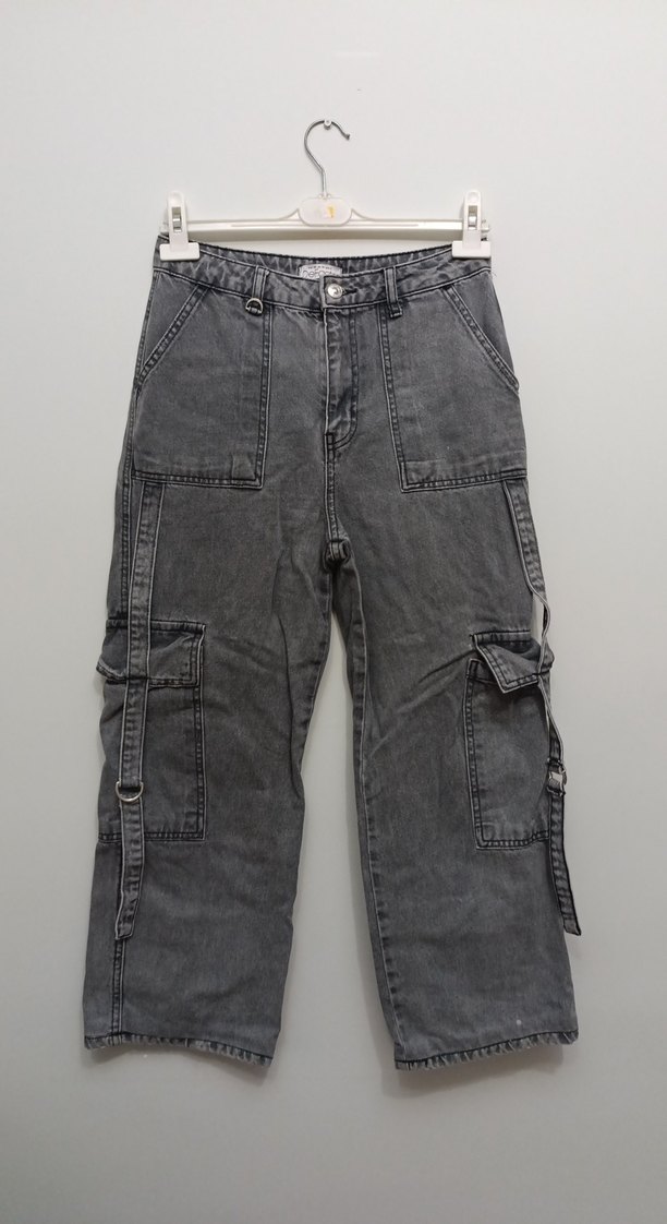 Geniş kesim, kemerli gri kot pantolon. Çoklu cepler ve midi boy ile günlük sokak stiline uygun rahat bir tasarım. İşlem gördü boydan.