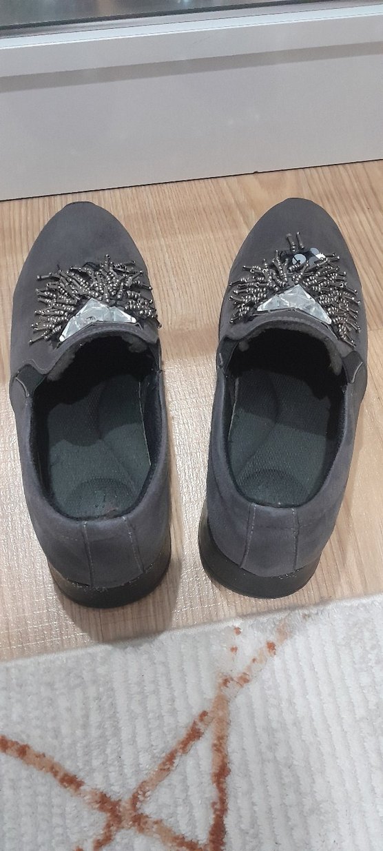 Gri renkte, toka detaylı, nakış işlemeli kadın günlük ayakkabısı, sokak stiline uygun.