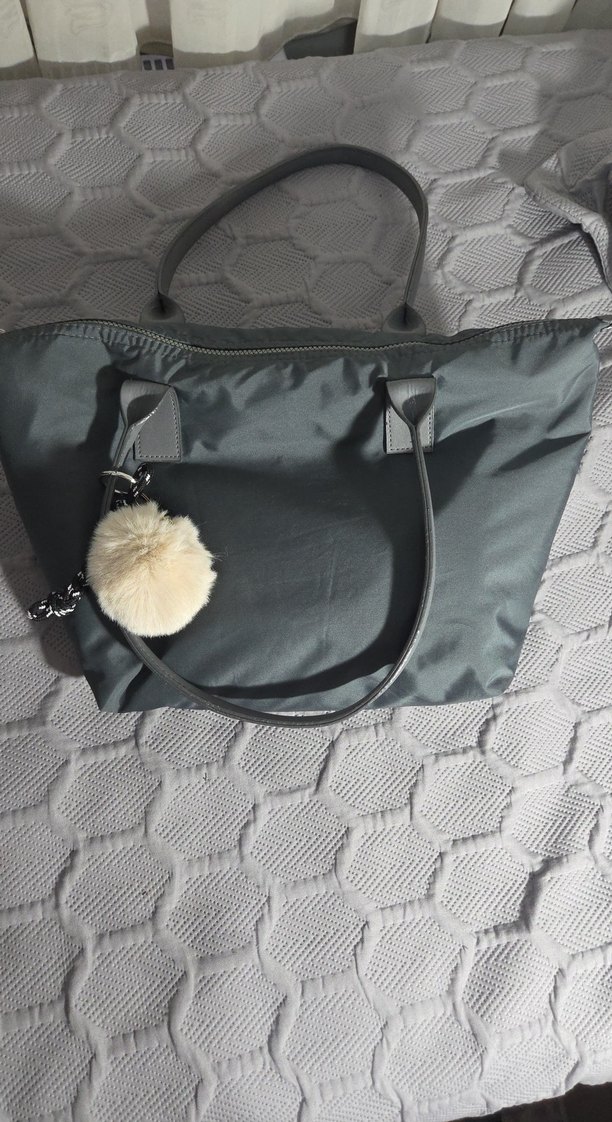 Gri renkte, kürklü detaylı, sentetik kumaştan yapılmış kadın günlük çanta. İki saplı, trend ve rahat stil için uygun. Charmlar fiyata dahil degildir