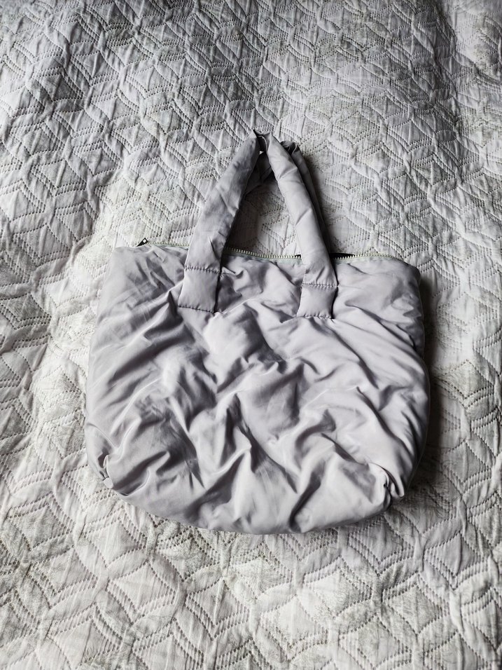 Gri renkte, yumuşak sentetik kumaştan yapılmış, kadın çantası. Kısa saplı, günlük kullanıma uygun alt kısmında ufak bi lekesi var