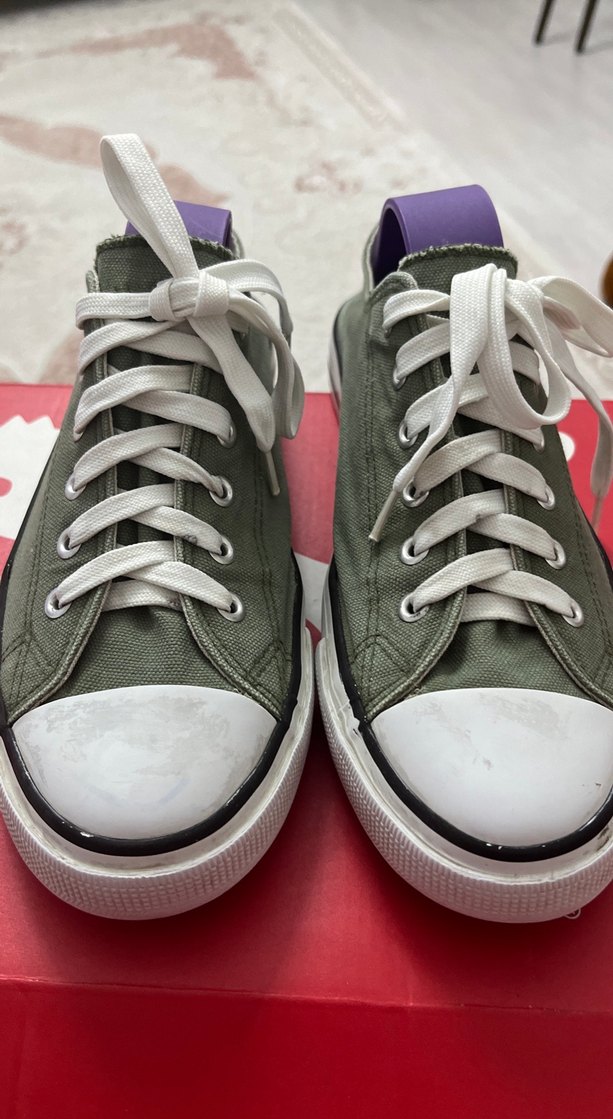 Gri renkte, düz tabanlı kauçuk spor ayakkabılar, beyaz bağcıklarla günlük kullanıma uygun sade ve şık tasarım sunar. Küçük içerisinde yirtiklar var fakat yaptırabilir