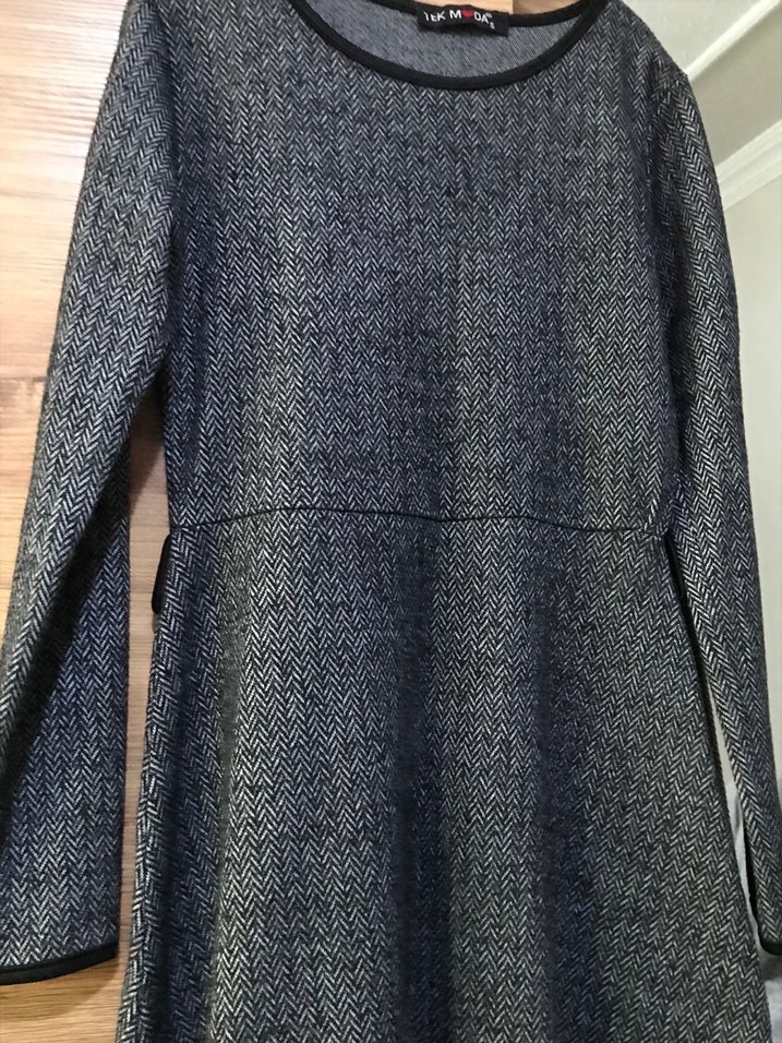 Gri renkte, yumuşak yün kumaştan, yuvarlak yakalı ve uzun triko elbise . Pilili ve rahat kesim, ofis için uygun normcore tarzda.