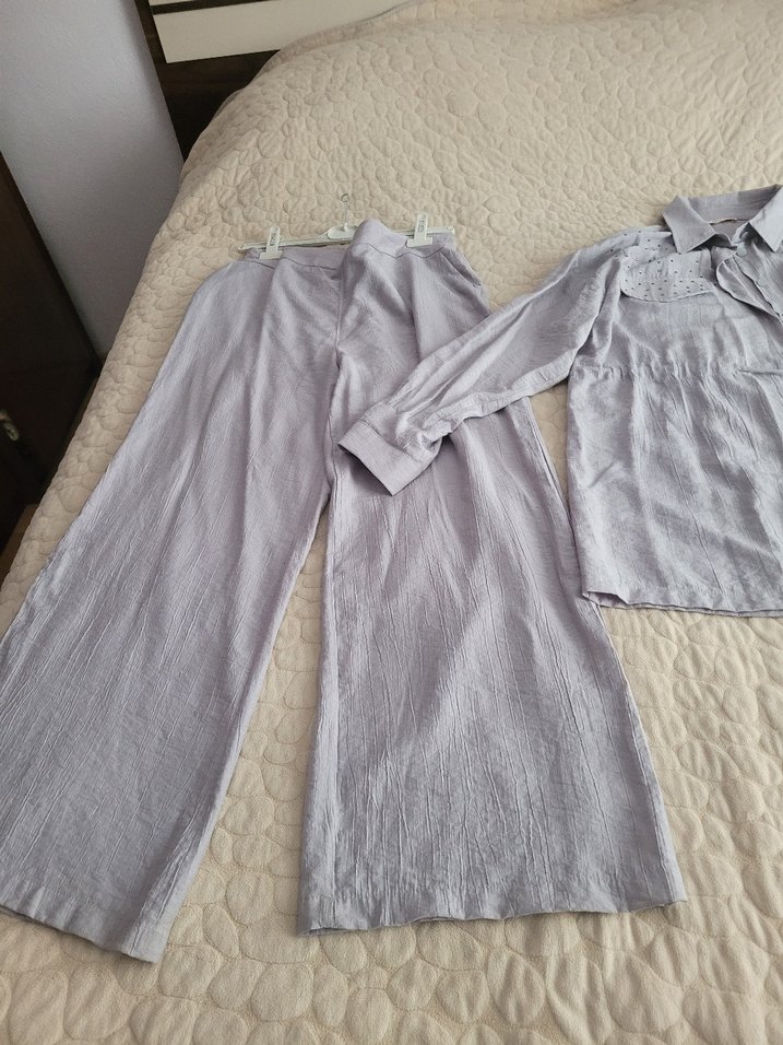 Gri renkte, uzun kollu ve bol kesim kadin ikili takım birkez düğünde giydim sıfır ayarında