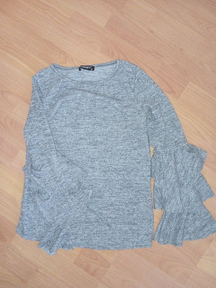 Gri renkli, bisiklet yaka ve uzun kollu kadın mini triko kazak. Yumuşak triko kumaştan, rahat ve desen içermeyen günlük kullanım için uygundur.