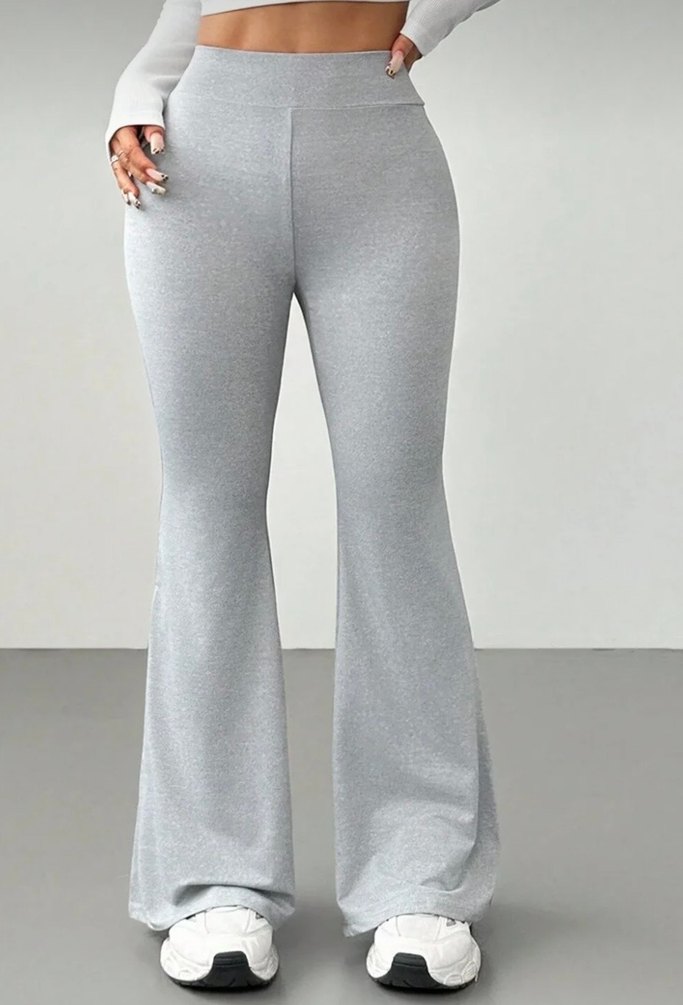 Gri, fitted kesim ve midi boyda, yumuşak sentetik kumaştan kadın ispanyol paça pantolon. Rahat ve şık, günlük kullanıma uygun.