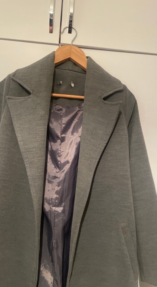 Gri renkli kadın kaban, klasik yakalı ve iç kısmı parlak astarlıdır. Yan cepleri ve düzgün kesimi ile şık bir görünüme sahiptir.