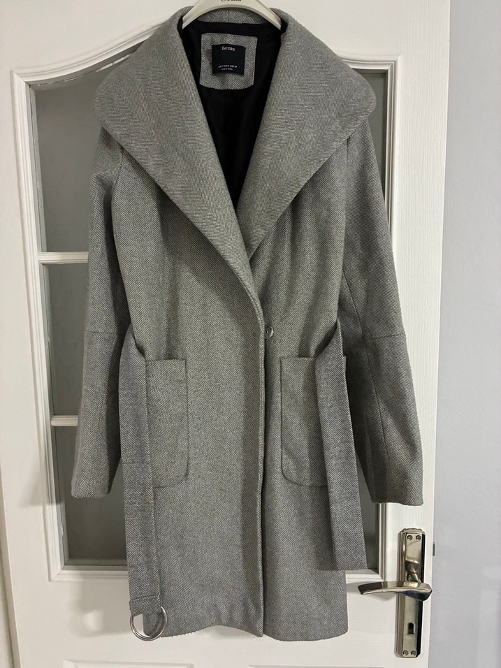 Gri renkli kadın kaban, büyük yaka ve ön ceplere sahiptir. Yumuşak ve sıcak kumaştan üretilmiştir, belde kemer detayı bulunur.