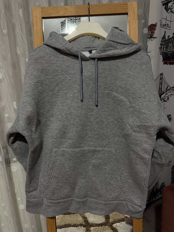 Gri renkte, kapüşonlu ve uzun kollu kadın sweatshirtü. Rahat kesimi ve yumuşak, sıcak kumaşıyla günlük kullanım için uygun, zahmetsiz şıklık sunar.