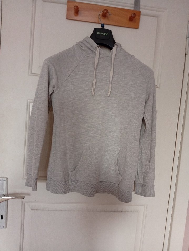 Gri, uzun kollu, bisiklet yaka ve bol kesim kadın sweatshirt. Yumuşak keten kumaştan, kapüşonlu ve ön cepli, rahat günlük stil için uygun.